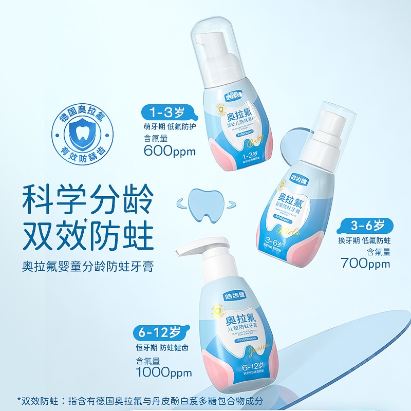 - 6-12歲:0.1%德國(guó)高純奧拉氟+氟化鈉雙防蛀,抗糖酸護(hù)恒牙,高延展防蛀精華適配正畸需求。
